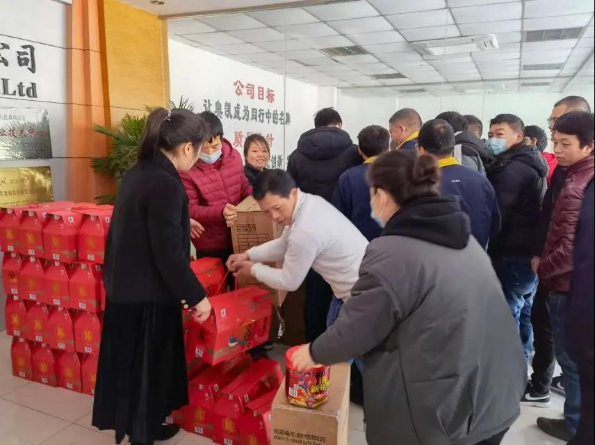 随着一份份福利品传递到员工手中,这些心意同时也承载了奥凯总经理及各位领导向每位员工的真挚问候与春节祝福。