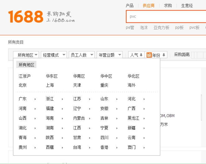 例如,阿里巴巴搜索,选择“供应商”然后选择地址